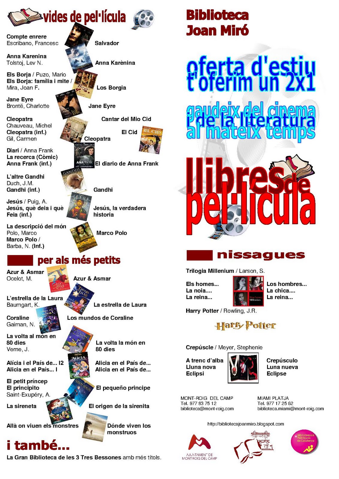 Aquest estiu us hem preparat una selecció de llibres que tenen pel.lícula. Segurament que molts de vosaltres, sobretot si sou lectors, teniu una certa reticència a les versions cinematogràfiques. Doncs bé, aquest estiu ho teniu fàcil. Teniu els tàndems llibre + pel.lícula. Convertiu-vos en crítics i feu-nos arribar la vostra opinió. I ja sabeu que el bloc de la Biblioteca està encantat de rebre les vostres opinions i suggeriments.